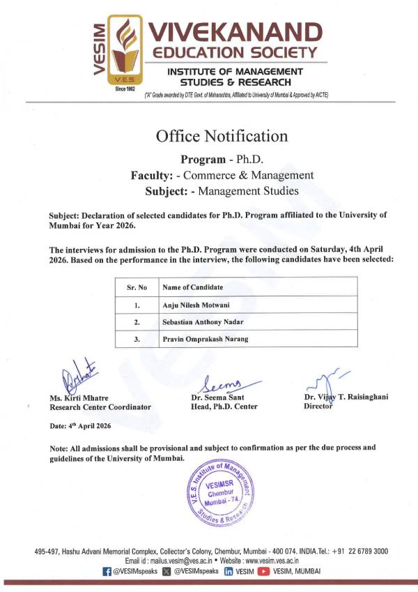 I extend a hearty welcome to you on behalf of Vivekanand Education Society’s Institute of Management Studies & Research (VESIM). We, at VESIM, are committed to creating an environment for nurturing leadership skills in students through innovative and proven pedagogy. To achieve this, we have always pursued a multidisciplinary approach that focuses on market trends, technologies, corporate ethics, and core values that contribute to all round development of a student.