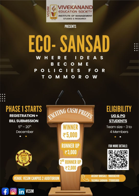 We are pleased to inform you that VESIM is organizing Eco-Sansad 2025-26 - A National-Level Inter-Collegiate Mock Parliament Competition for UG & PG students. The event aims to engage students in policy drafting, meaningful debate, and constructive dialogue in a simulated parliamentary setting.