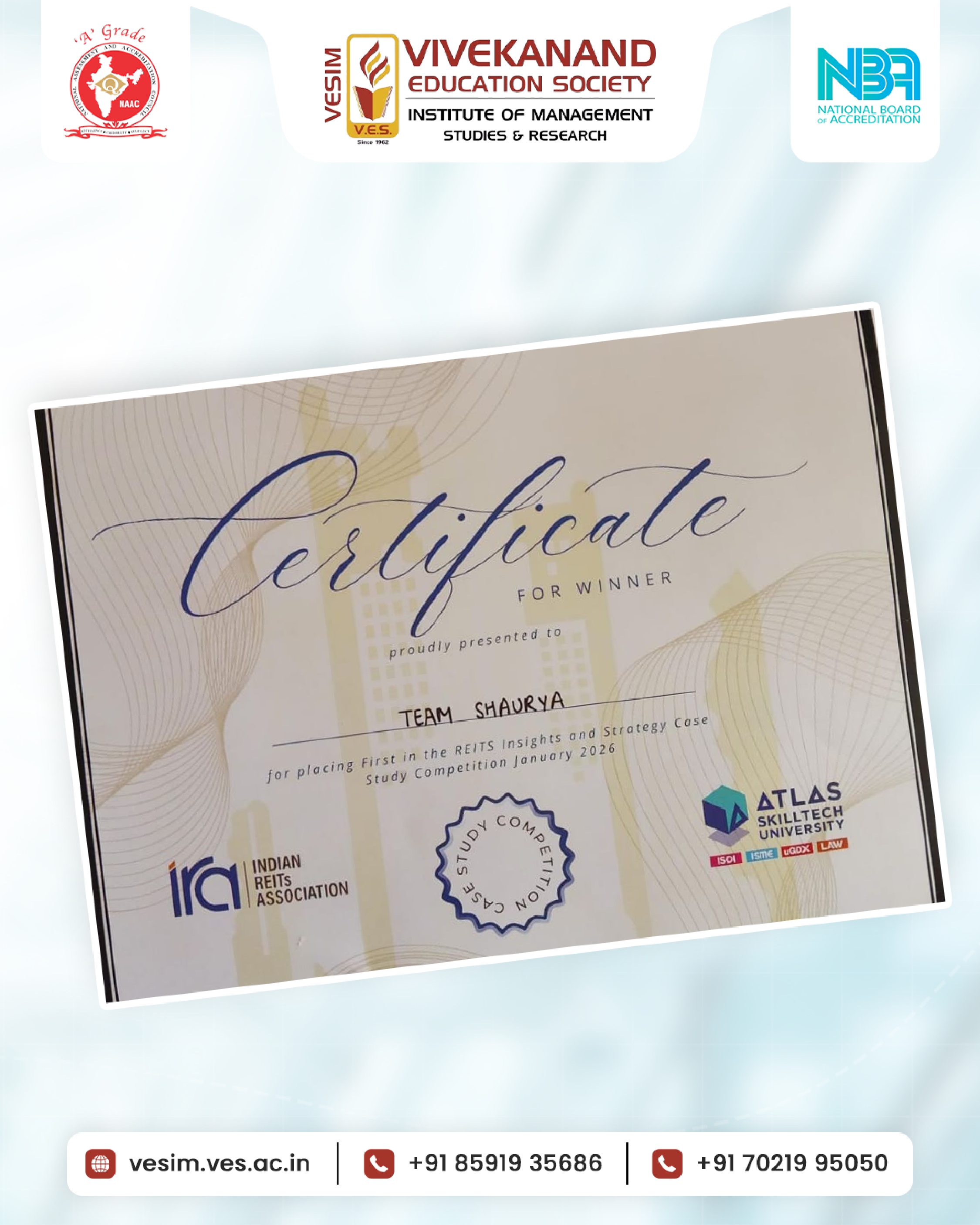 Our MMS students represented VESIM at the REIT Insights & Strategy Case Study Challenge 2026, presented by the REITS India Association in alliance with ATLAS SkillTech University, held on 30th January 2026, and secured the 1st Prize among strong inter-collegiate competition.